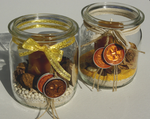 Preis: Glas + Dekosand + Bienenwachskerze aus eigener Imkerei + 5 Dekokugeln 23,00 €