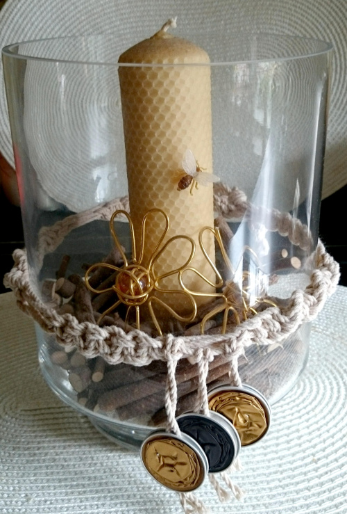 Bienenwachskerze, Dekoanhänger aus Nespresso-Kapseln, Blüten Aludraht mit Glasmurmel