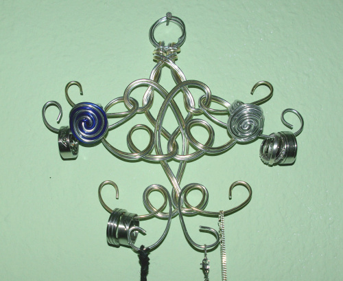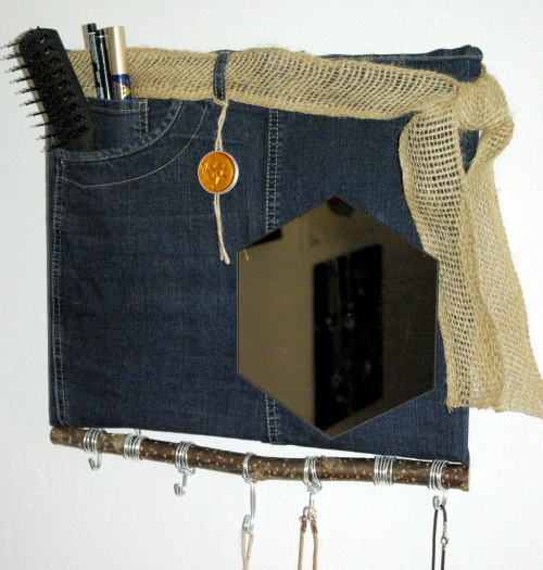 Jean auf Holzbrett, Halter für Ketten etc. Ast mit Aludraht
